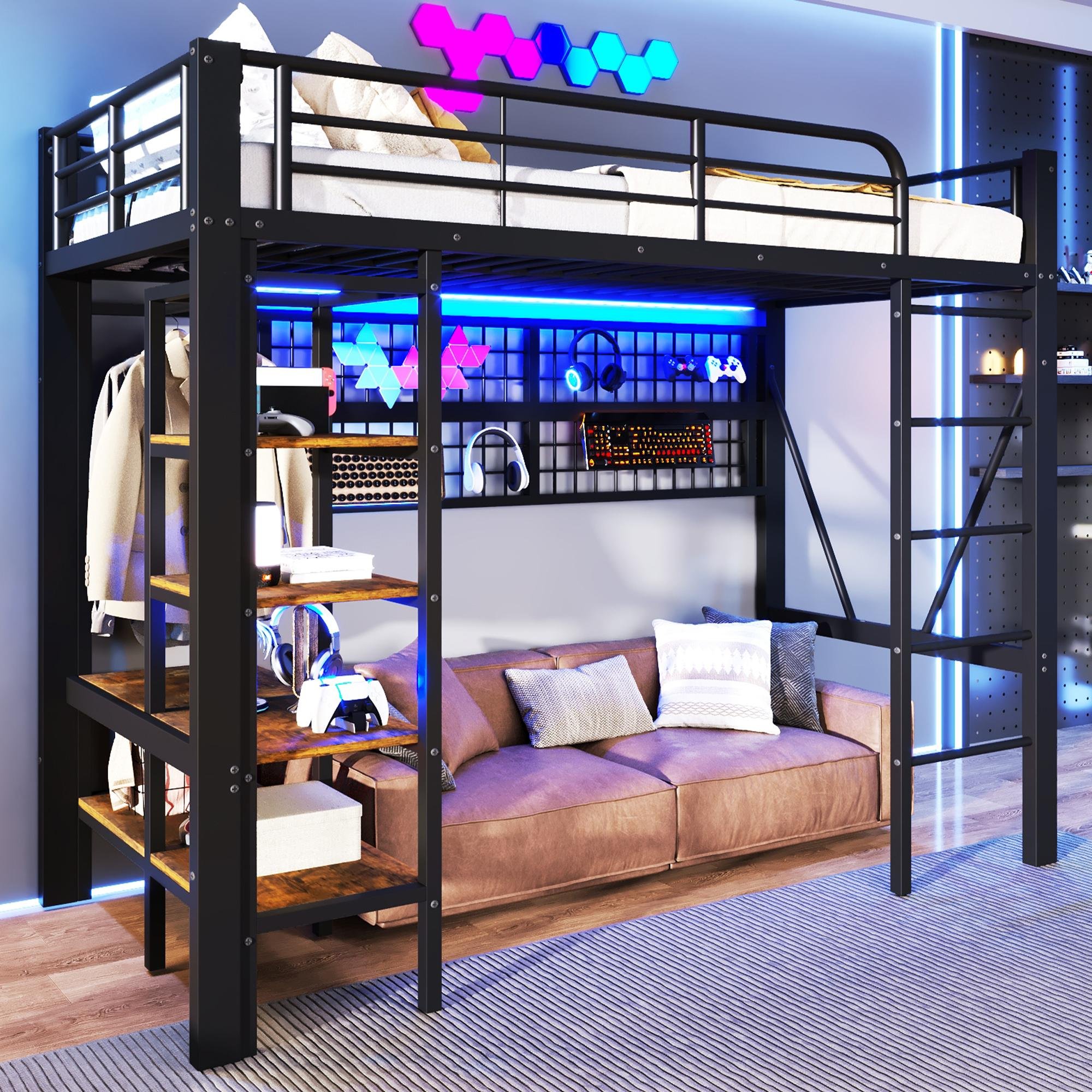 Lit mezzanine superposé enfant adolescent 90x200 cm pin massif gris étagère rangement sommier lattes