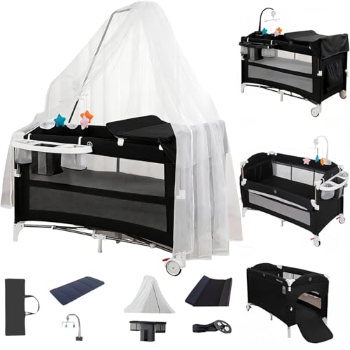 Nine point nine Lit Parapluie avec Table à Langer, Confortable et Robuste Lit Parapluie Bebe avec Matelas, Hauteur Réglable Berceau Bébé Evolutif, Mobile Baby Bed (6602 Black with Net)