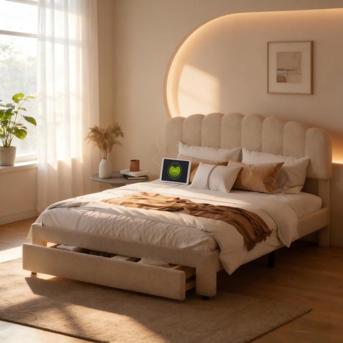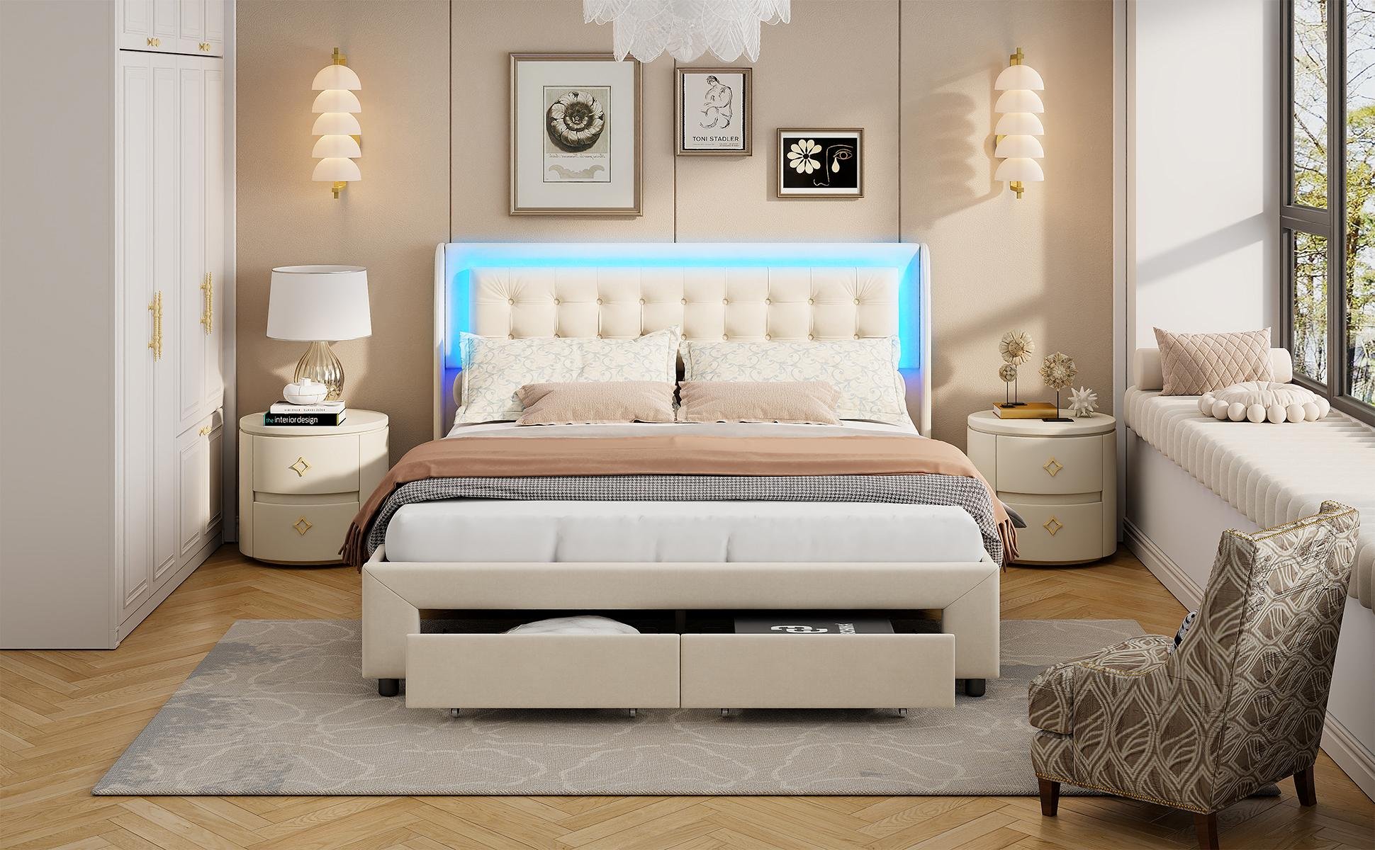 Lit 140x190 cm en velours avec rangement hydraulique, tiroir, sommier à lattes et led beige chicfurn