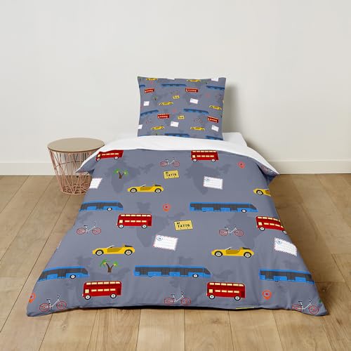 Hiseng Housse de Couette Enfant, Dessin Animé Parure de Lit Enfant, Housse Couette Ado Garçon Fille, Microfibre Housse de Couette + 1/2 Taie d'oreiller (90x190cm,Voiture Grise)