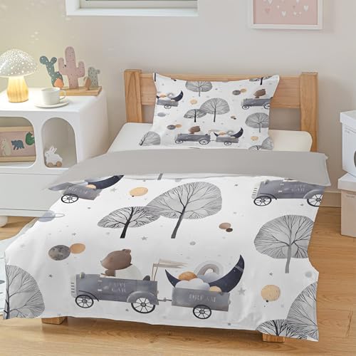 CCZM Housse de Couette 90x190 Voiture Ours, Parure de Lit 1 Personne Imprimée Remorque Lune Planètes, Linge de Lit Étoiles Réversible avec 2 Taie d'oreiller, Fermeture Éclair, F-497