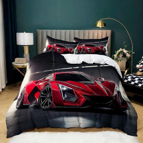 Rouge Housse de Couette 90x190 Voiture de Course de Voitures de Sport 3D Parure de Lit Garçon Fille en Microfibre Chambre Décor Housse Couette avec Fermeture Éclair avec 2 Taies d'oreiller 65x65 cm