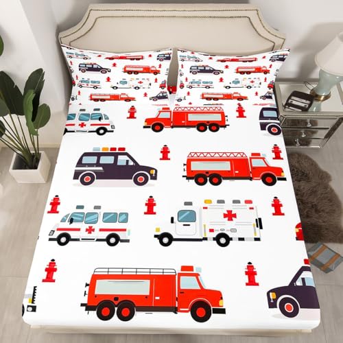 Homewish Drap Housse 90x190 Enfant Voiture de Police de Camion de Pompiers,Drap-Housse Ambulance de Dessin Animé,Drap de Lit Fournitures de Pompiers Véhicules de Voitures de Pompiers 1 Taie d'oreiller