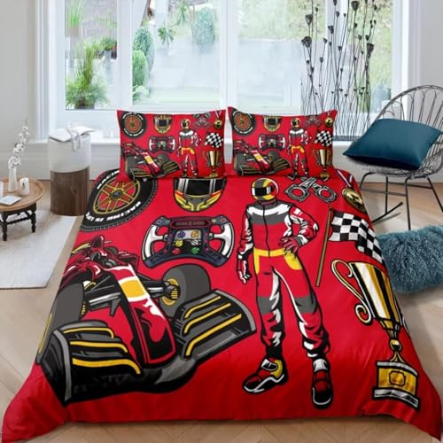 LUYAPOND Parure de Lit 90x190 Enfant Formule Voiture Rouge Housse de Couette 90x190 avec Fermeture Éclair - Sets de Housse Couette en Microfibre, avec 1 Taie d'oreiller 65x65 cm