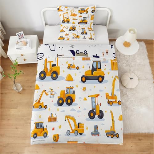 dyausi Housse de Couette 90x190 Excavatrice Parure de Lit 1 Personne en Microfibre, Housse Couette Voiture, Ensemble de Literie Chantier de Construction avec Taies d'oreiller, Jaune Blanc, H74