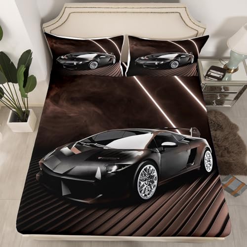 Homewish Drap Housse Garçon 90x190 cm avec 1 Taie d'oreiller, Drap-Housse 1 Personne Enfant Voiture de Course Noir, Drap de Lit Voiture de Sport Extrême Housse de Matelas Marron Noir