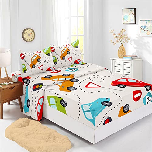 Odot Parure de Lit avec Drap Housse Drap Plat Taie Doreiller, Motif Dessin Animé Draps Housses Bonnet 40cm, pour Adultes Enfant, Lit 1~2 Personnes (90x190cm-3 Pieces,Voiture de Dessin animé)