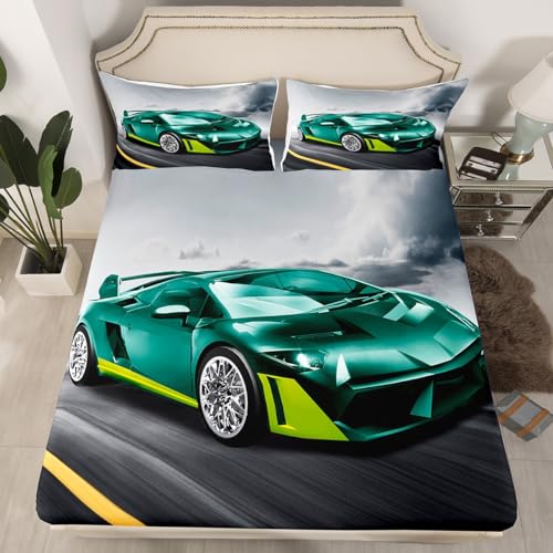 Homewish Drap Housse Enfant 90x190 cm avec 1 Taie d'oreiller, Drap-Housse 1 Personne Ado Garçon Voiture de Course Noir, Drap de Lit Voiture de Sport Extrême Housse de Matelas Sarcelle