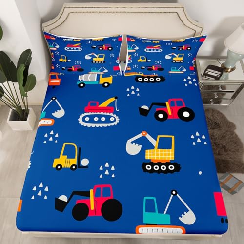 Homewish Drap Housse Voiture 90x190 Enfant Garçon Parure de Lit en Microfibre 1 Personne, Drap de Lit Construction de Dessins Animés, Housse de Matelas Excavateur Bulldozer Tracteur