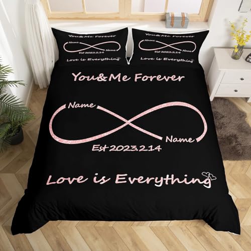 Homewish Housse de Couette 220x240 Couples d'amour, Personnalisation des Noms et des Dates, Ensemble de Literie l'amour est Tout, Parure de Lit Cadeaux de La Saint-Valentin, Noir Argenté