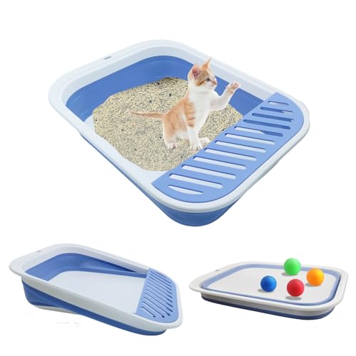 MUYG Litière pliable pour chat - Pot ouvert - Bac à litière pliable et portable avec pelle - Étanche - Entrée basse pour chaton et chat - Facile à nettoyer - 45 x 34 x 12,4 cm - Bleu