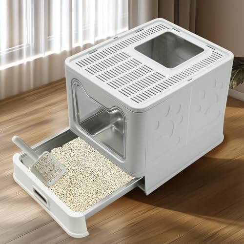 Maison de Toilette pour Chat, Bac à Litiere Chat Autonettoyante, avec Pelle, Bac à Litière Fermé Plateau Amovible pour Un Nettoyage Facile, Litière pour Chat XXL (Gris, 49 * 37 * 35cm)