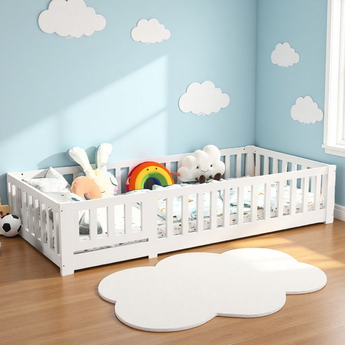 Lit Au Sol Enfant 90x200 cm - Lit Simple avec Barrières de Sécurité - Cadre de Lits 1 Place pour Bébés - Bois Massif - Blanc