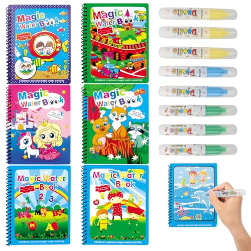MINISOISO Livre de Dessin de l'eau, 6 Pièces Livre Magique avec Stylo à l'eau, Livre d'eau Magique Réutilisable pour Enfants, garçons, Filles, pour Tout-Petits, Cadeau de Noël