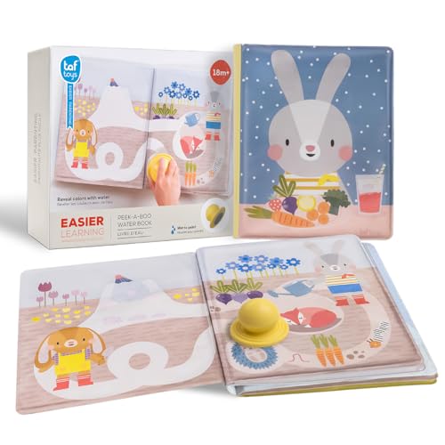 Livre Magique à l’Eau Bébé – 12 Pages Réutilisables avec Tampon Inclus – Images Colorées qui Apparaissent à l’Eau – Éveil Sensoriel et Curiosité – Dès 18 Mois – 21,5 x 17 cm