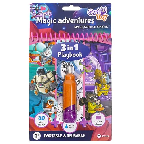 QwiToy Livre de Jeu 3 en 1, 3 activités, Livre de coloriage avec Stylo Magique d'eau, scènes Ouvertes avec Autocollants, Paysage Pop-up 3D avec Autocollants gonflables, Violet