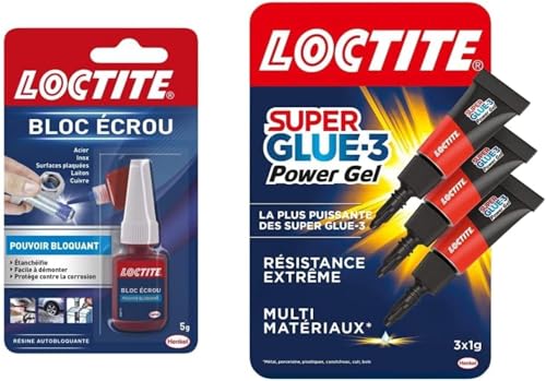 "LOCTITE Colle "Bloc Écrou" - Résine autobloquante pour éviter le desserage par vibration de boulons, 5 ml & Super Glue-3 Power Gel Mini Dose, colle forte enrichie en caoutchouc, lot de 3 tubes 1 g
