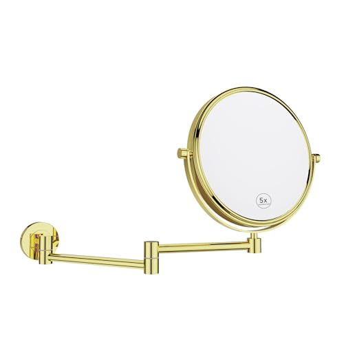 Nicesail Miroir Maquillage Mural Doré - Miroir Grossissant x5 - Long Bras - Rotation à 360 ° - Double Face - Extensible - Salle de Bain,Diamètre 20cm