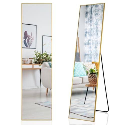 Marctani Miroir sur pied complet – Grand et long avec 3 façons d'utilisation, autonome, montage mural et support – Cadre en aluminium pour chambre, salle de bain ou salon Doré 161 x 52 cm
