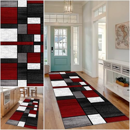 Tapis de Cuisine antidérapant 2 m, Lavable en Patchwork, Gris, Rouge et Blanc – Long Tapis de Couloir pour la Maison, la Cuisine et la Chambre à Coucher, Taille 50 x 200 cm