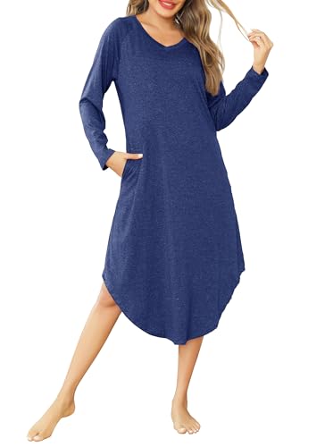 Wikoan Chemise de Nuit Longue Femme Chemise de Nuit Hiver Robe Coton Col en V Robe de Nuit Femmes Pyjama à Manches Longues avec Poches Bleu Foncé S