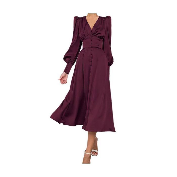 Robe longue satinée femme bordeaux élégante style vintage à manches bouffantes coupe évasée et col en V pour soirée ou cocktail XS