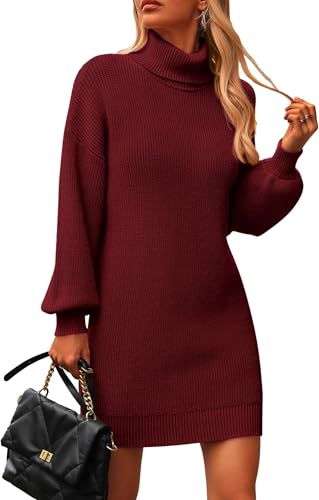 Zeagoo Robe Pull Femme Manche Longue Col Roulé Tricot Robes Hiver Chic et Elegant Moulante Mini Robe Bordeaux M