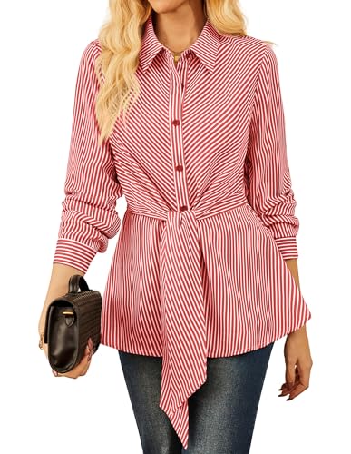 GRACE KARIN Chemisier rayé à manches longues pour femme - Chemise d'affaires boutonnée - Haut péplum à nouer sur le devant, Rouge, M