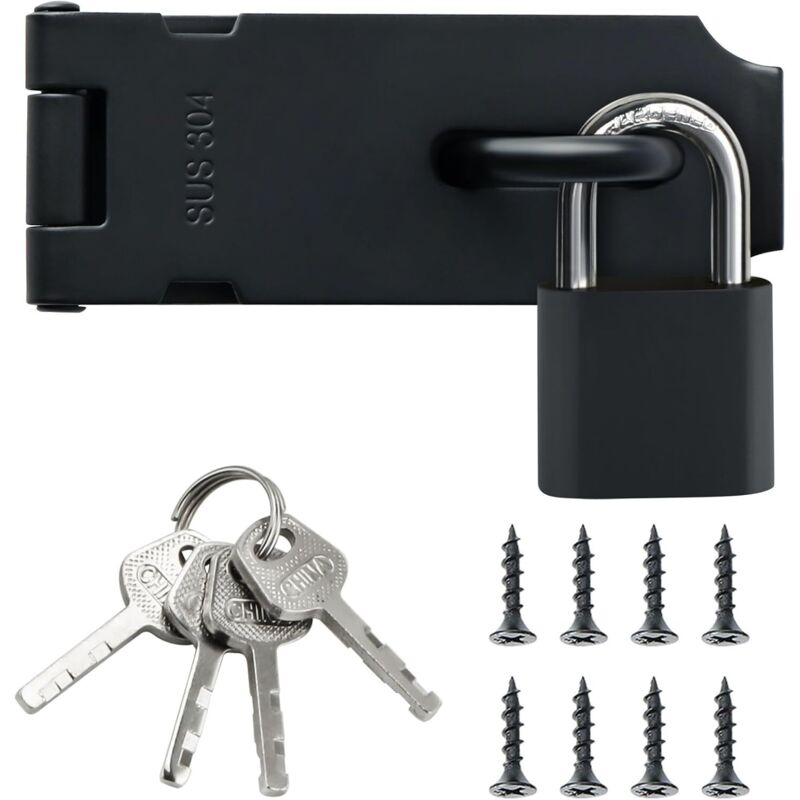 Verrou Porte Exterieur/Interieure Avec Cadenas, Loquet Porte Coulissante Noir En Acier Inoxydable Pour Portail, Jardin, Cabanon, Ems350b-Set