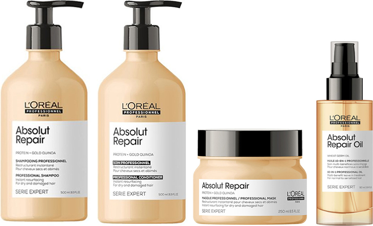 Shampooing L'Oréal Absolut Repair 500 ml NOUVEAU + Après-shampooing L'Oréal Absolut Repair 500 ml NOUVEAU + Masque L'Oréal Absolut Repair 250 ml NOUVEAU + Huile L'Oréal Absolut Repair 10 en 1 90 ml NOUVEAU