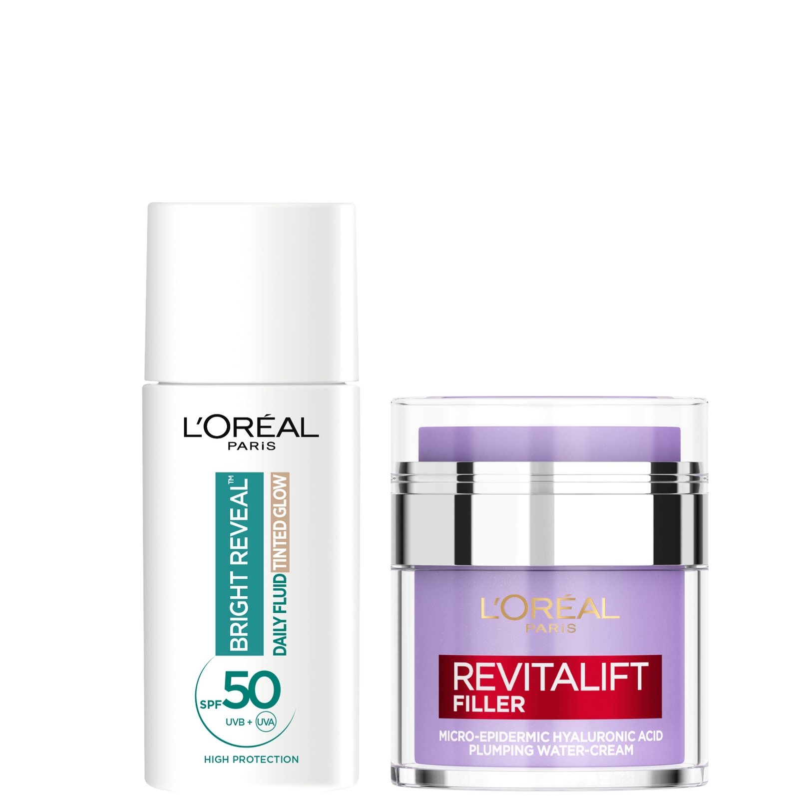 L'Oréal Paris - Fluide Anti-UV SPF50+ et Gel-Crème Repulpant - Action Hydratante, Anti-âge, Correctrice et Protection UV - Bright Reveal 50ml et Revitalift Filler 50ml - Lot de 2 Soins Visage