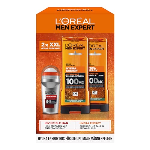 L'Oréal Men Expert Kit de soin pour homme avec gel douche XXL et déodorant roll-on, cadeau pour homme, avec gel douche et déodorant roll-on, Hydra Energy, Heat Protect, 2 x 400 ml, 1 x 50 ml