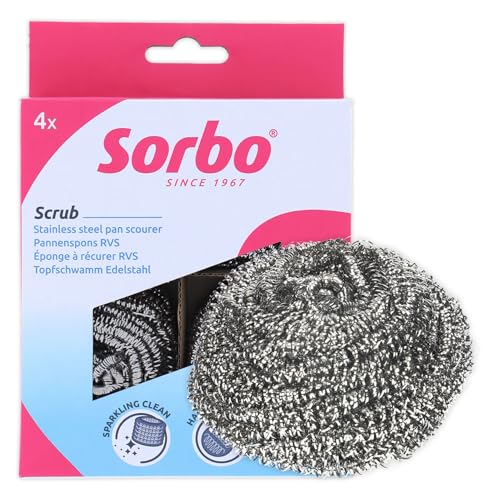 Sorbo Éponge Inox - Éponge à Récurer en Acier Inoxydable pour Saletés Tenaces, Adaptée aux Casseroles, Plats au Four, Gril et Barbecue, Structure Fine, Lot de 4