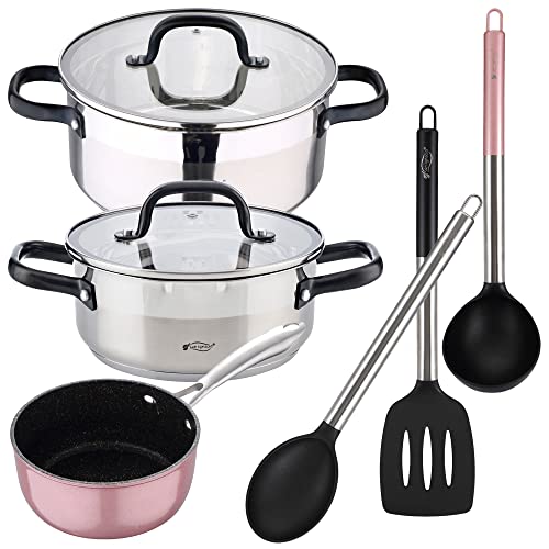 alpina 8711252173900 Lot de 7 casseroles en acier inoxydable avec couvercle Passe au lave-vaisselle Toutes les sources de chaleur, Gris Argenté