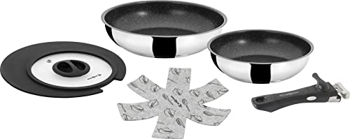Moneta Accordo Inox Lot de 6 Casseroles et Poêles, Revêtement Extérieur en Acier Inoxydable Brossé, Convient à Toutes les Plaques de Cuisson, Va au Lave-vaisselle, Batterie de Cuisine 6 Pièces