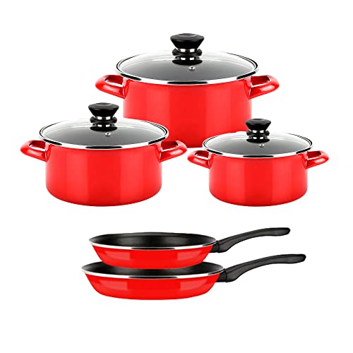 Riess, 0558-008 Lot de 5 casseroles en émail NoUVELLE, Rosso Extra Fort, composé de : casserole avec couvercle en verre 16, 20, 24 cm, casserole avec couvercle en verre 20 cm, poêle en émail 28 cm