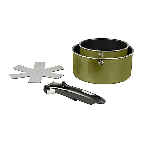 Sitram 715710 Lot de 2 Casseroles Aluminium Recyclé Ø 16 et 20 cm colori Vert Metallisé Revêtement intérieur anti-adhésif sans PFOA + manche amovible + 1 feutrine - Tous feux dont induction