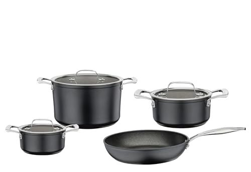 Berndes Lot de 4 casseroles en aluminium avec couvercle en verre antiadhésif et compatible tous feux à induction, cocottes en fonte d'aluminium avec revêtement anti-adhésif Noir