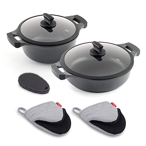 Metaltex XPERT Lot de 2 casseroles en aluminium moulé sous pression Hauteur 24 cm et casserole basse 28 cm Avec gants et éponge en silicone