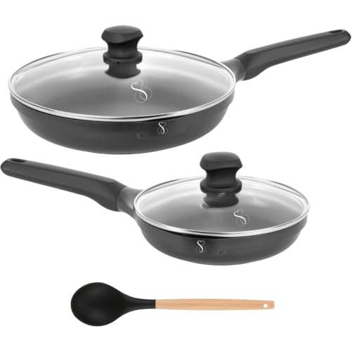 Stone&Stone Lot de 2 poêles 20 cm 24 cm extrêmement anti-adhésives | Gaz Induction | Poêle professionnelle en aluminium et acier avec revêtement allemand + 2 couvercles 1 cuillère | sans PFAS