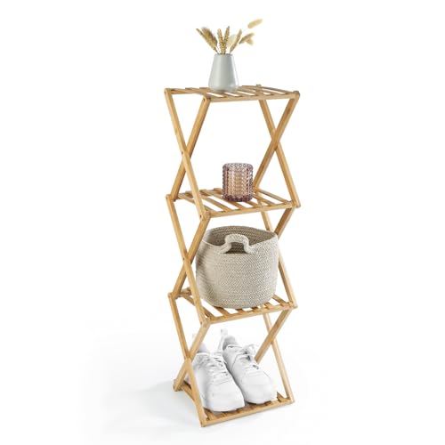 Lumaland Étagère en bambou à 4 étages pliable | Organiseur – Idéal pour garde-robe, dans la salle de bain et comme étagère de cuisine | Étagère pour décoration – Sans montage, étroite, peu encombrante