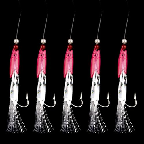 NiuLumea Sabiki Lot de 5 leurres de pêche souples avec 6 hameçons, tête rouge, perles Lumi Flash Lumi en feuille d'aluminium, hameçons en acier à haute teneur en carbone 3/0# pour hareng et maquereau
