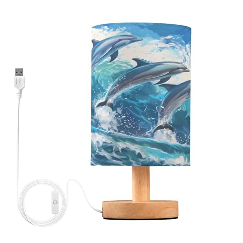 Mnsruu Lampe de chevet dauphins sautés bleu océan lampes de chevet lumière LED lampe de bureau abat-jour en tissu petite lampe pour chambre à coucher salon (ampoule incluse)