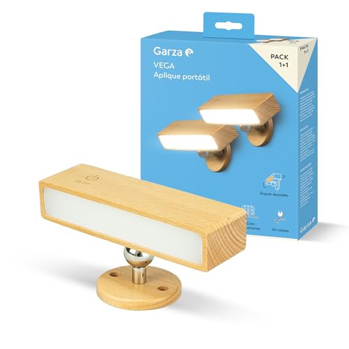Garza - Pack 1+1 Applique LED Murale Portable Vega 2W 240lm, lumière réglable 4000K, Batterie 3000mAh jusqu'à 30 Jours, USB-C, Installation sans Fil, Design en Bois Clair