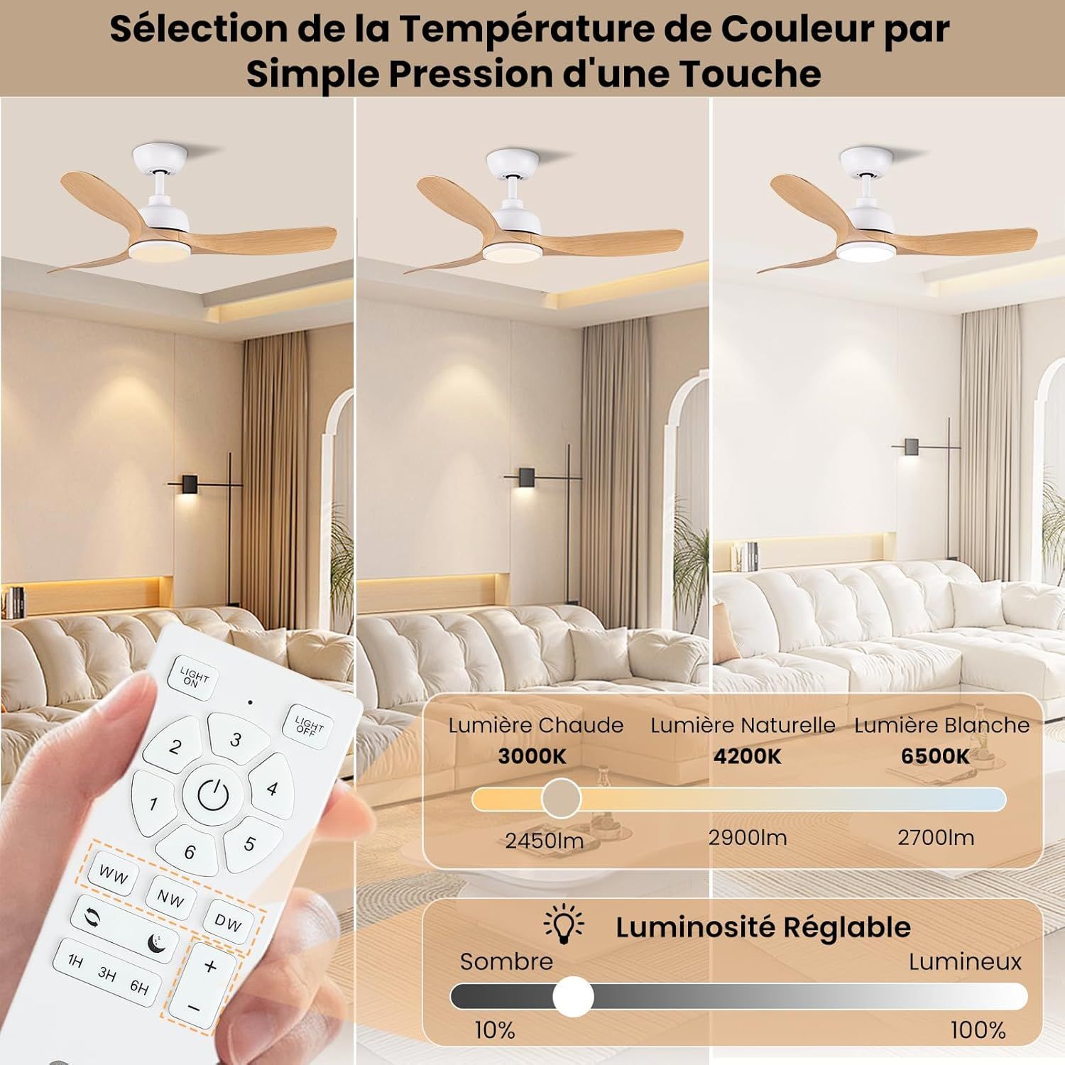 SUBZONAL-Ventilateur Plafond avec Lumiere, 107cm Ventilateur Plafond avec Telecommande Bois, 6 Vitesses, Minuterie, 3 CCT Dimmable, Silencieux Réversibles CC, Mémoire Fonction, Mode Veille, 3 Pale