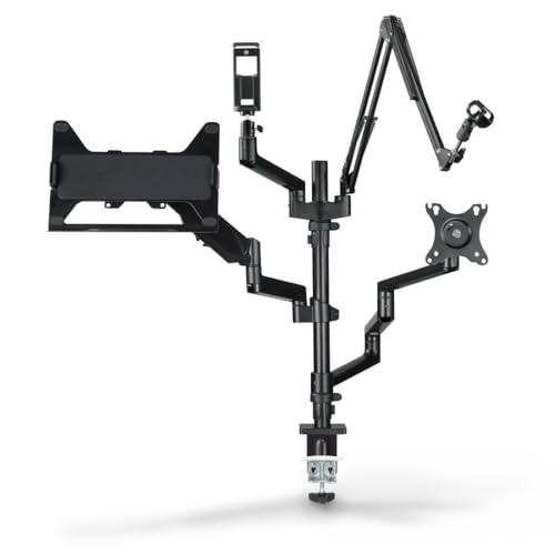 Hama Support Écran avec 4 bras réglables en hauteur (pour 2 moniteurs, micro, caméra, lumière ou smartphone – Inclinable, pivotant, trépied de table idéal Streaming) Noir
