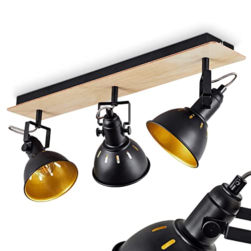 Plafonnier Safari, lampe de plafond moderne en métal/bois en noir/chrome/or/marron clair, luminaire au design rétro/vintage avec abat-jour réglable et effet lumineux, 3 flammes, E14, sans ampoules