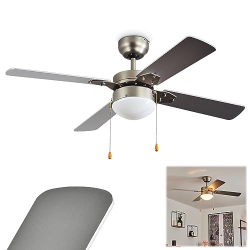 Plafonnier ventilateur Hamnvik, lampe en métal nickel mat avec abat-jour argenté/plastique blanc, luminaire/ventilateur commandable via interrupteurs, réglable 3 niveaux vitesse, 1x E14, sans ampoules