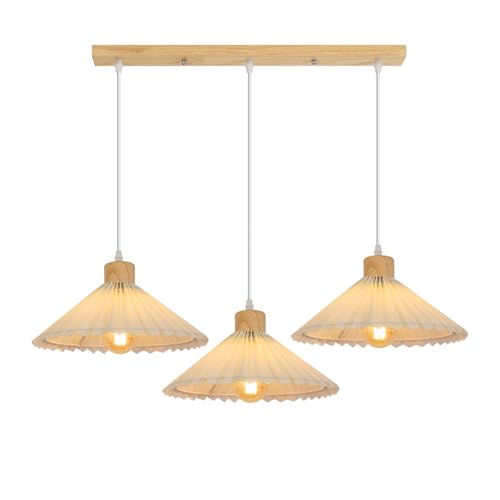 Goeco Suspension Luminaire en Bois, 3 Lumières Lampe Suspension Rétro E27 Avec Abat-jour en Tissu, Plafonnier Blanc pour Salle à Manger Chambre Salon Couloirs (Sans Ampoule)