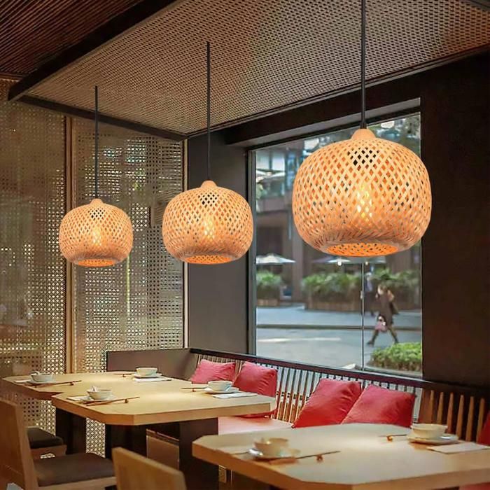 WOTTES Lampe en bambou tressé Lampe en rotin tressé Luminaire 3PCS lustre suspension bambou Sphérique naturel Ø25 x H 18 CM